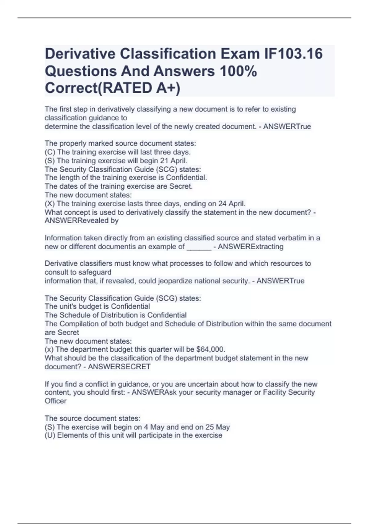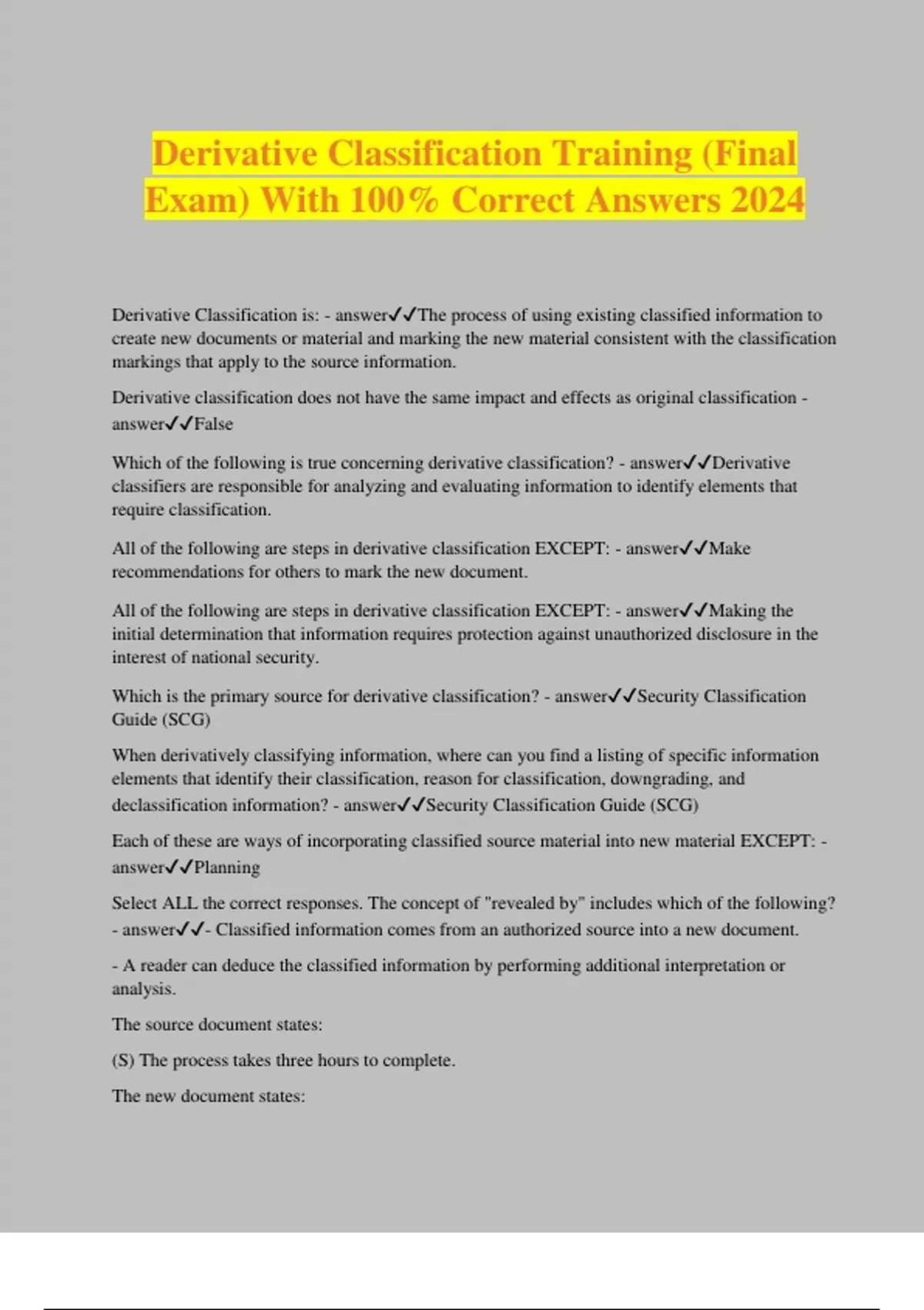 Derivative classification exam questions and answers 2022/2023 (verified answers) the document that provides basic guidance and regulatory requirements for. Which of the following is an authoritative source for derivative classification?